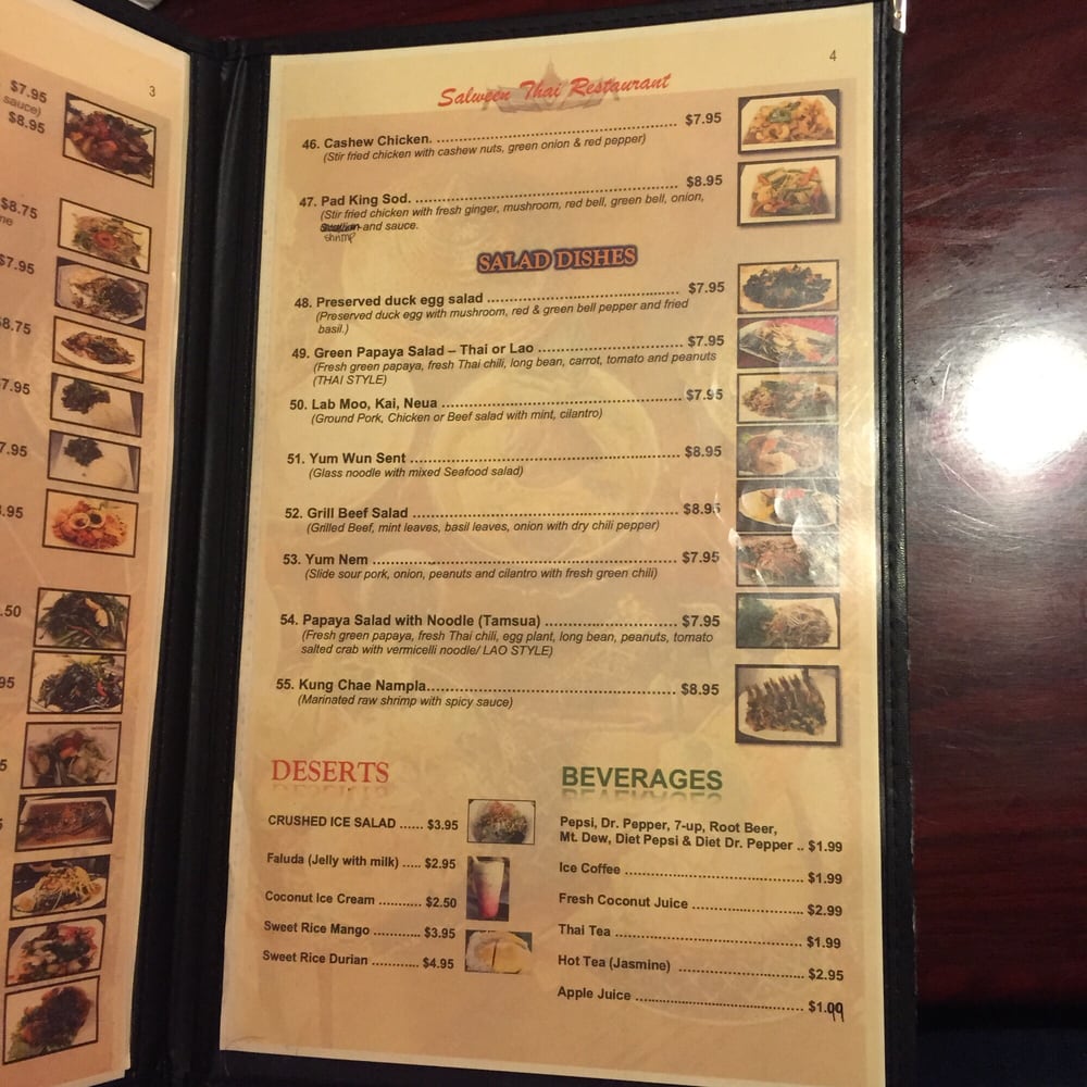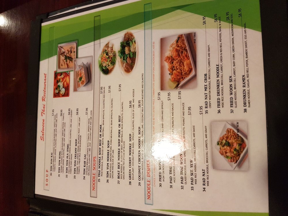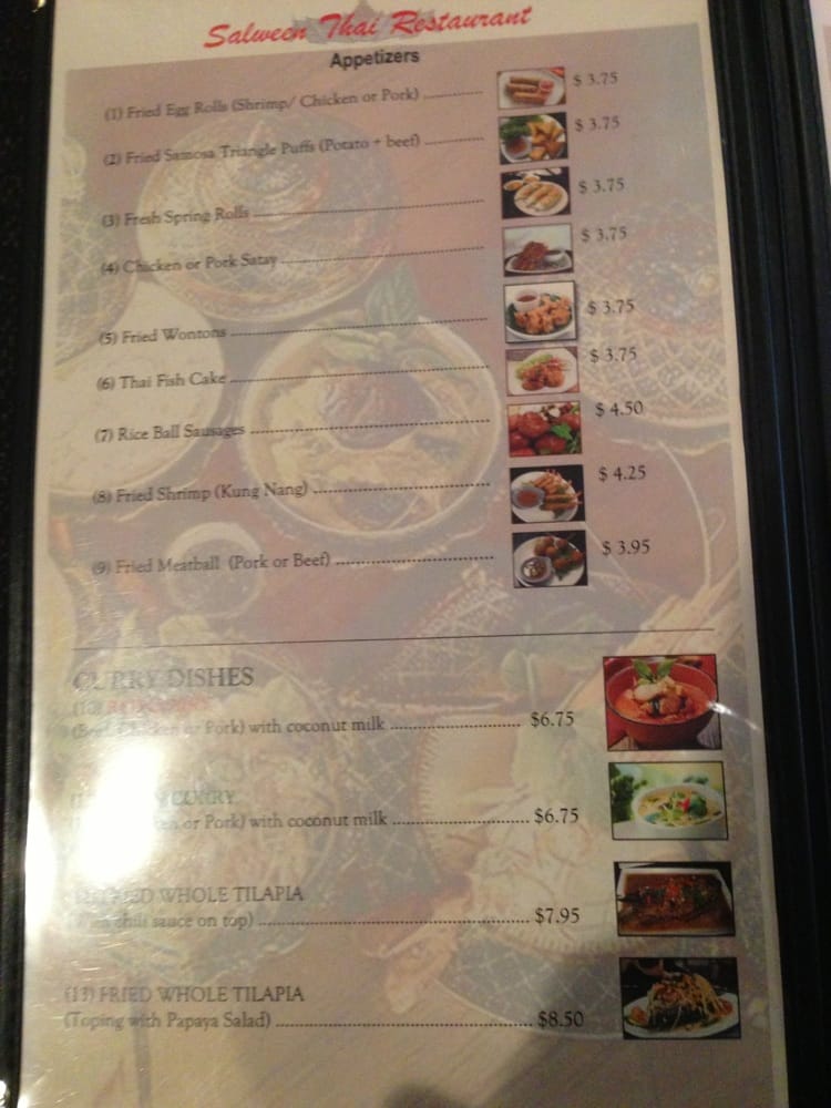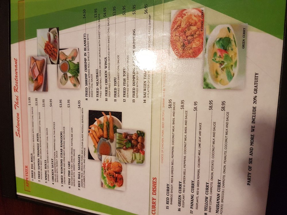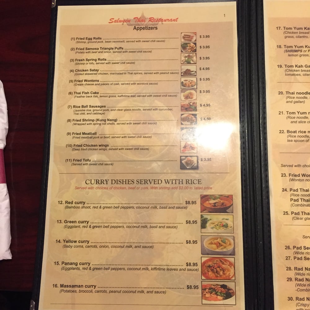 Salween Thai, located in Omaha, offers a variety of authentic Thai dishes with a cozy ambiance and attentive service. The menu features a wide selection of appetizers, noodle dishes, and rice dishes. Highlights include flavorful appetizers like the Chicken Satay and Crab Rangoon, as well as noodle dishes such as Pad Thai and Drunken Noodle. The rice dishes, like Thai Fried Rice and Pineapple Fried Rice, are also popular choices. Customers rave about the delicious food, generous portions, and the ability to customize spice levels to their preference. Whether dining in or ordering takeout, Salween Thai is a top choice for Thai cuisine enthusiasts in the area. The reviews from customers highlight the quality of the food and service, making it a must-visit spot for Thai food lovers.